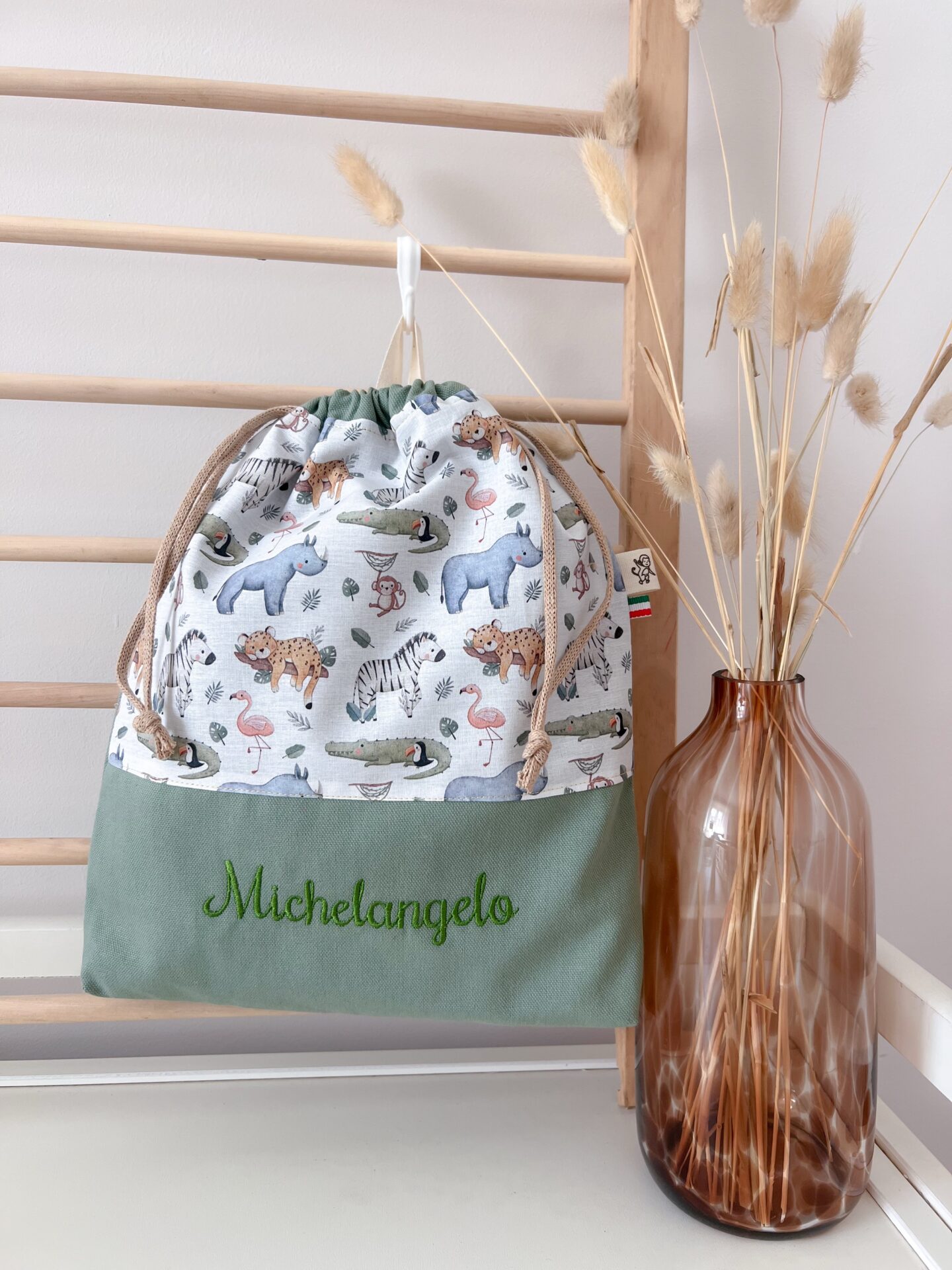 Bellissimo sacchetto porta cambio. Buon materiale e fantasia bella. Ricamo del nome top. Davvero stupendo. Ordinerò sicuramente lo zainetto abbinato.